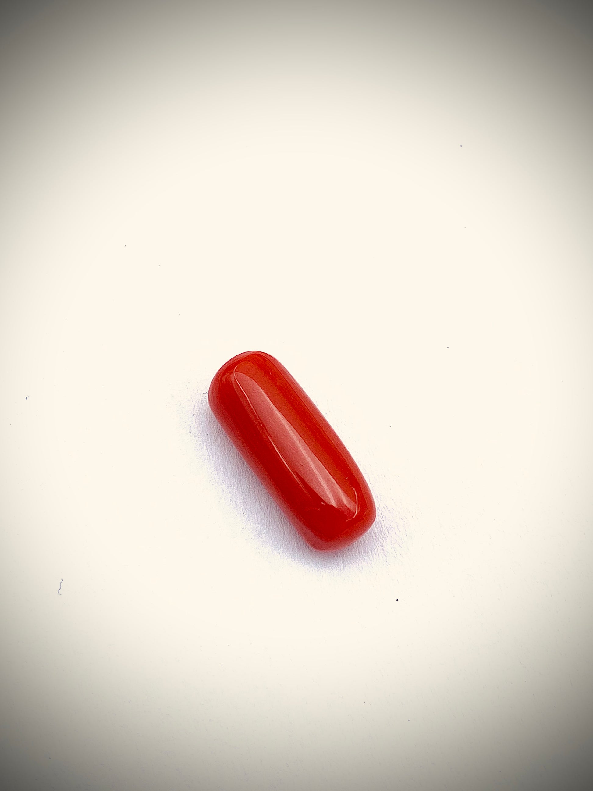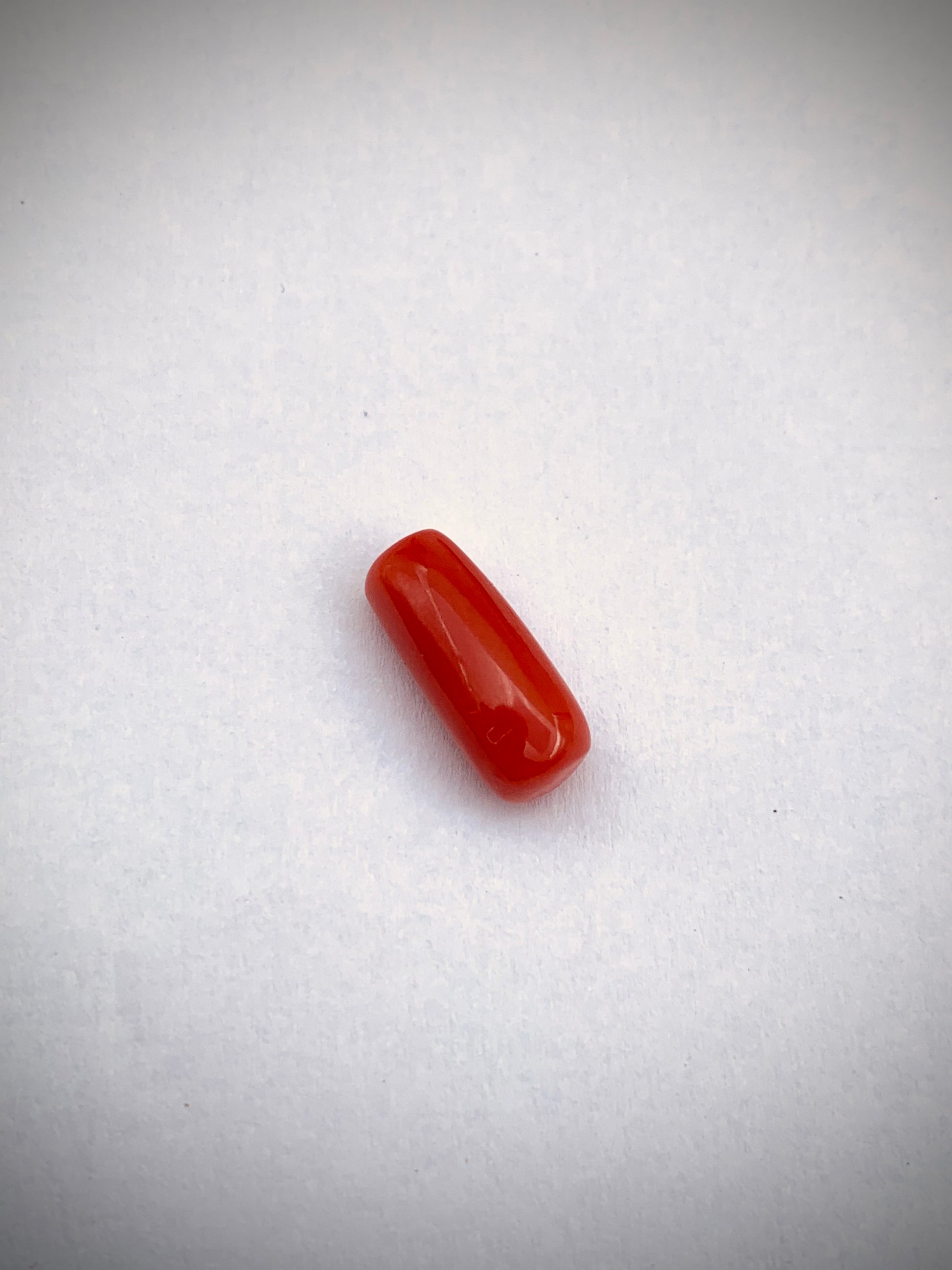 Discover the vibrant energy of this Natural Coral gemstone, weighing 6.96 carats, and cut in a smooth, oval cabochon. This beautiful coral, offered by Astrogems India, exhibits ideal proportions of 15.8 x 7.1 x 6.9 mm – perfect for both jewelry and astrological use.